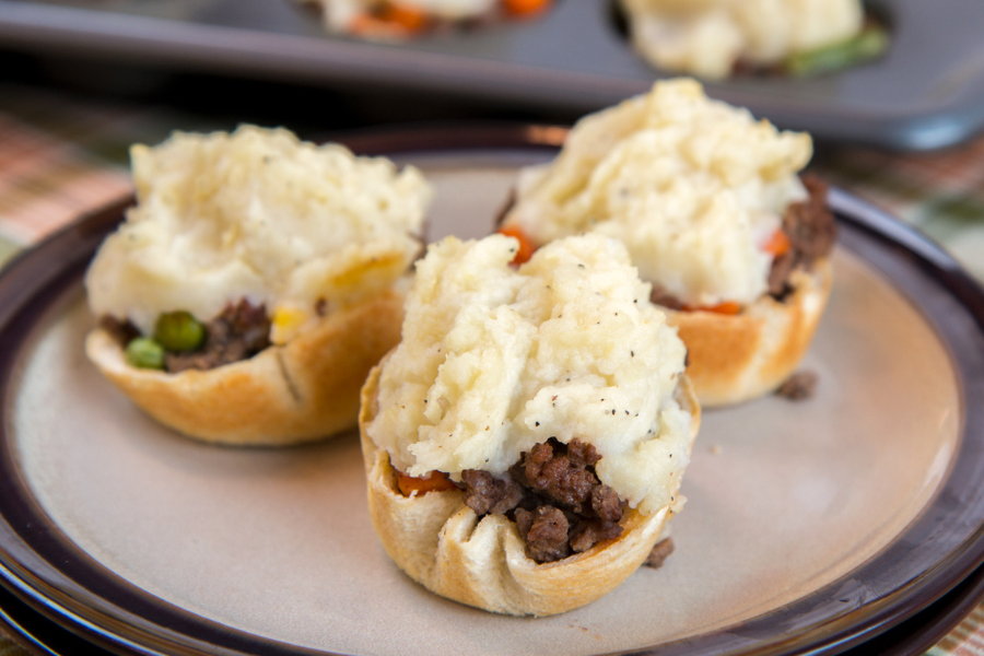Mashed potatoes top off these savory mini pies baked inside toasted cups of Martin’s Butter Bread. Fill with vegetables and ground beef (or turkey) and bake in individual portions for easy leftovers management.