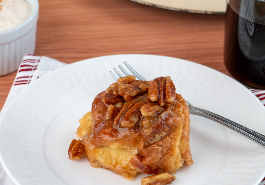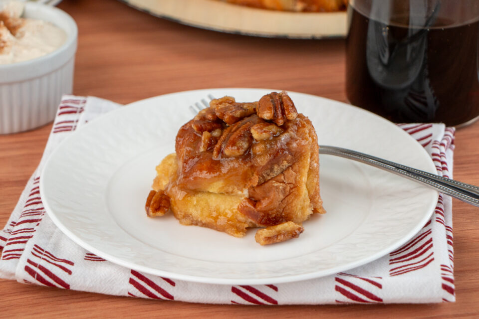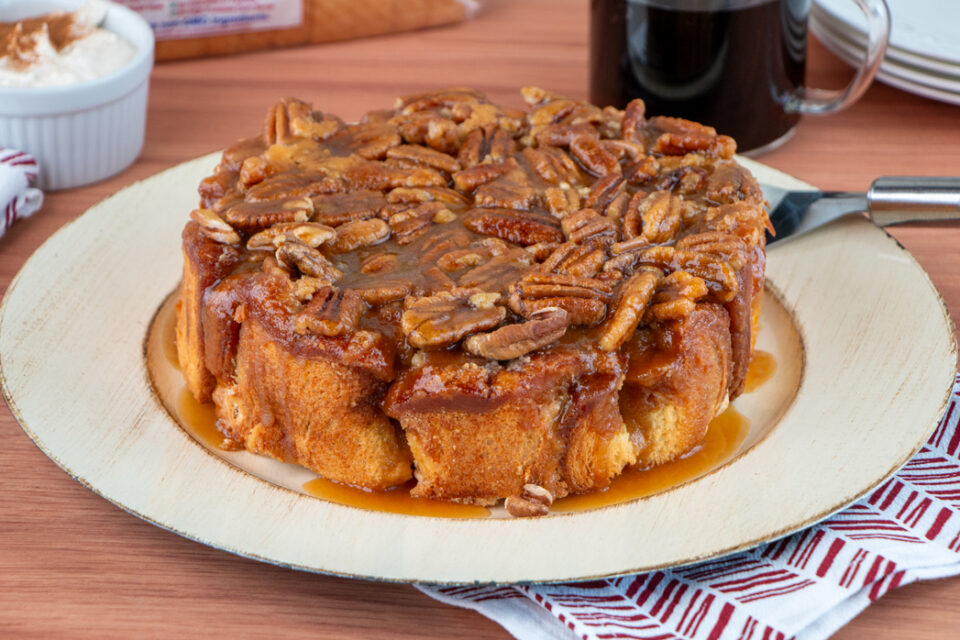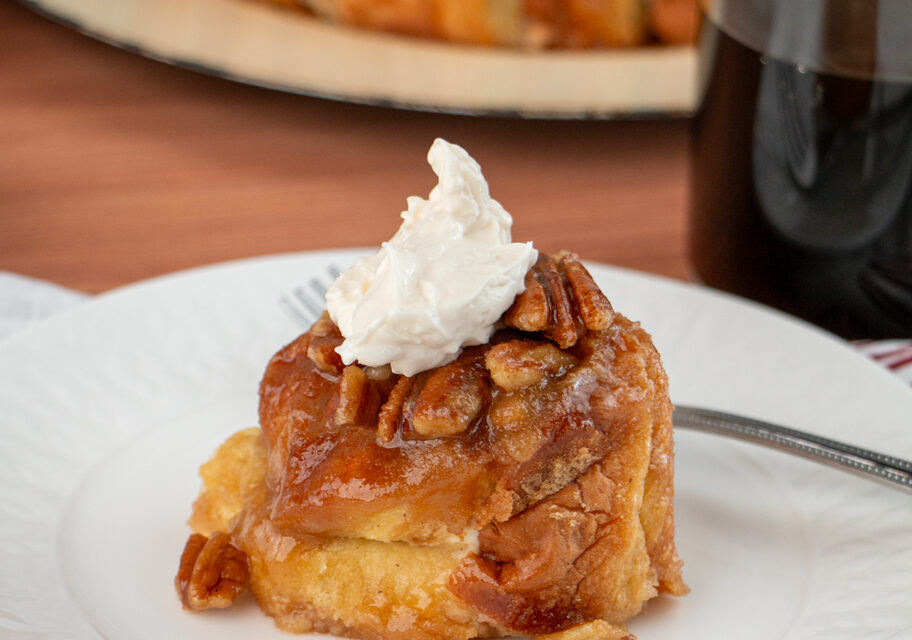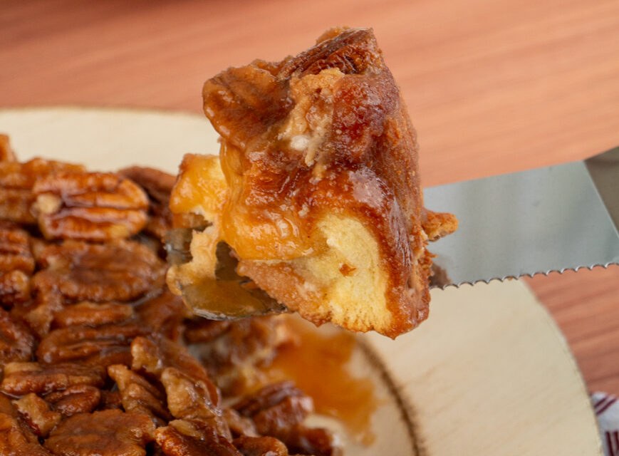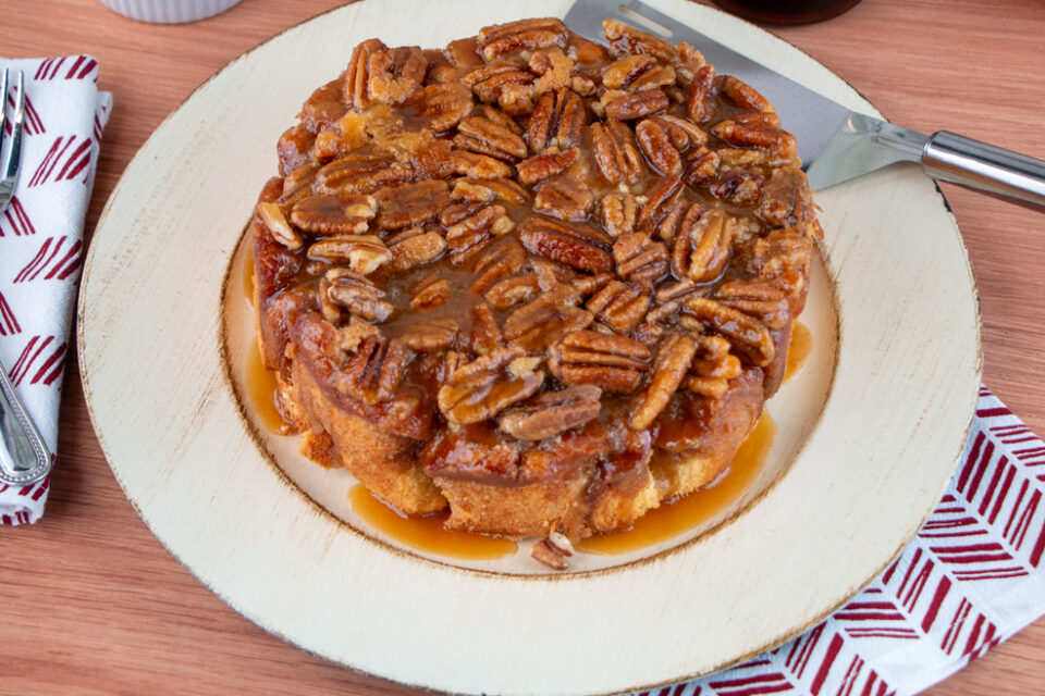 Spray sides of 8-inch round cake pan with oil. Pour 2/3 of caramel mixture into the cake pan. Sprinkle the pecans on top of caramel. Assemble the roll-up buns inside the pan on top of caramel with the crust side down. Press down on the roll-ups so they are level with the top of the pan. Pour the rest of caramel over the top of the roll-up buns.