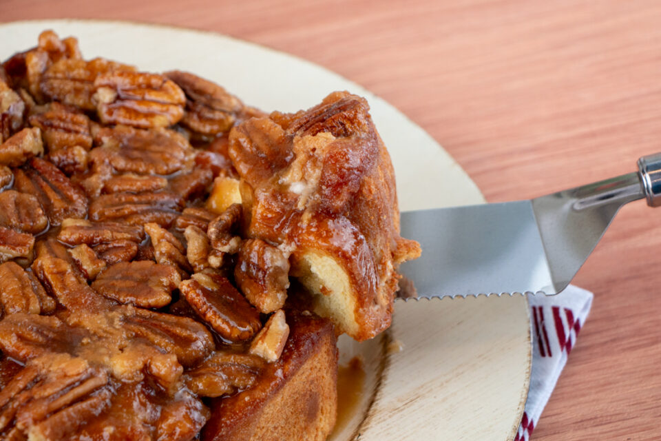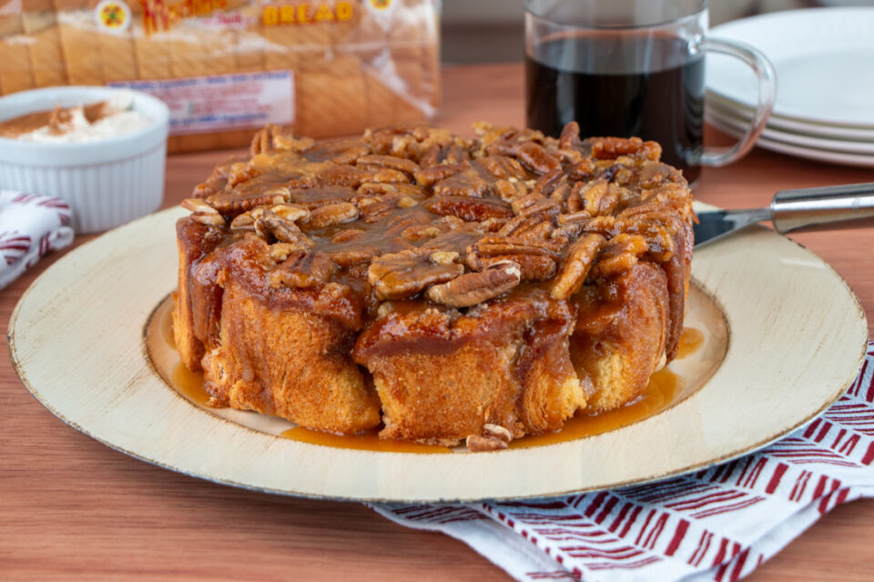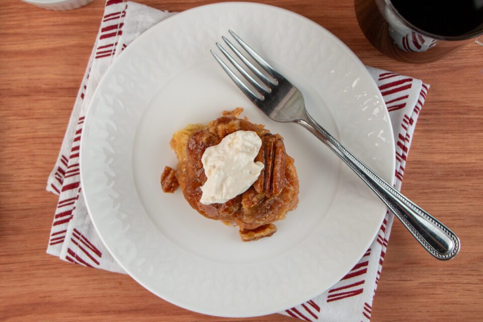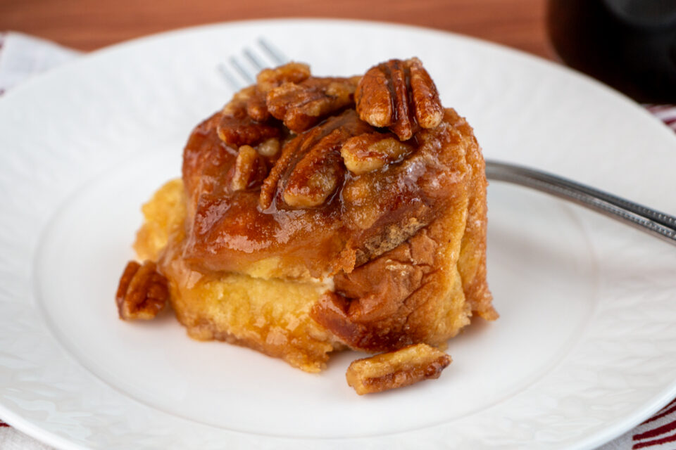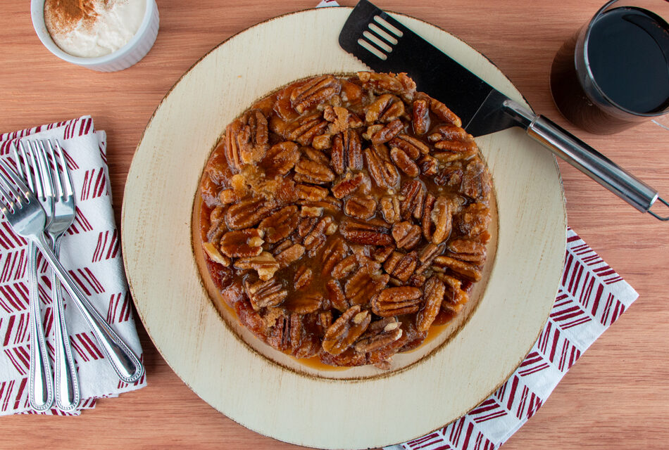 Spray sides of 8-inch round cake pan with oil. Pour 2/3 of caramel mixture into the cake pan. Sprinkle the pecans on top of caramel. Assemble the roll-up buns inside the pan on top of caramel with the crust side down. Press down on the roll-ups so they are level with the top of the pan. Pour the rest of caramel over the top of the roll-up buns.
