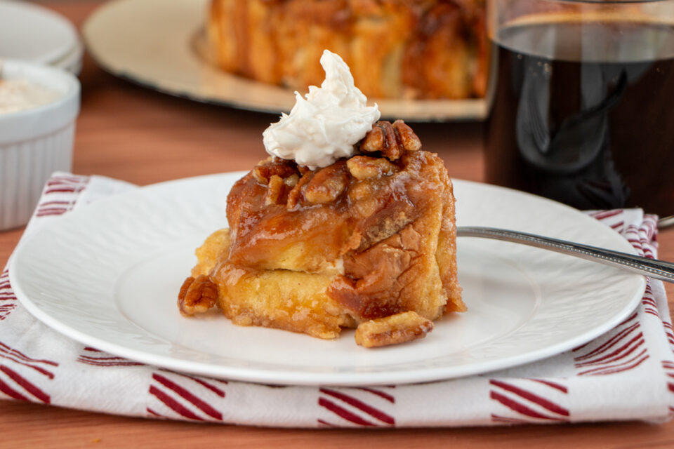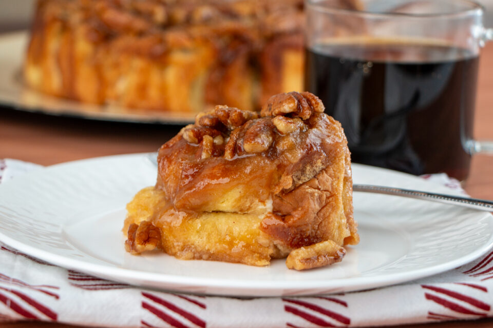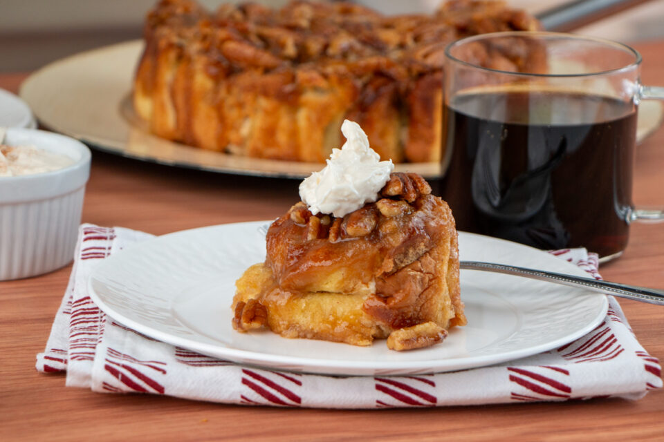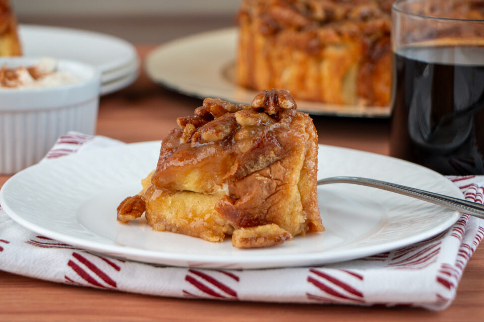 Remove from oven and place a large plate over the cake pan. Using oven mitts, invert the roll onto the plate, and remove the cake pan. Let cool for about 10 minutes, then serve warm.