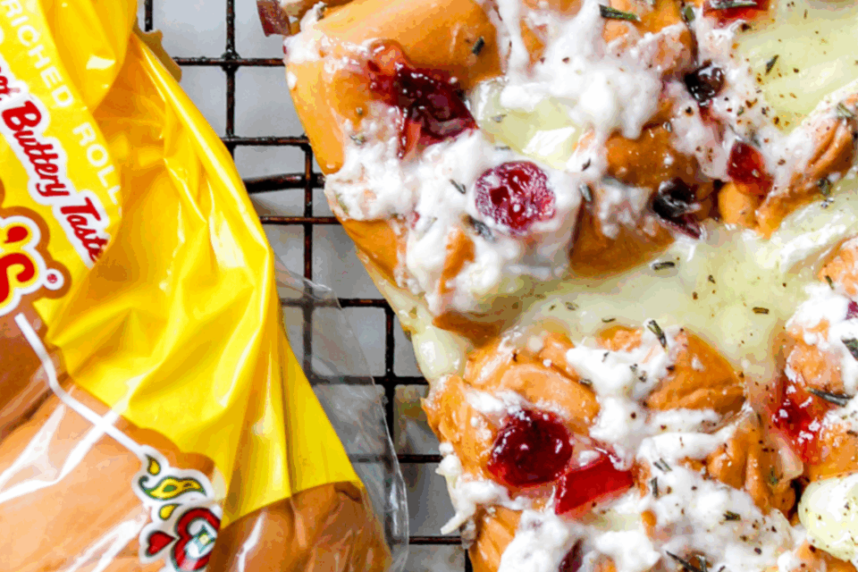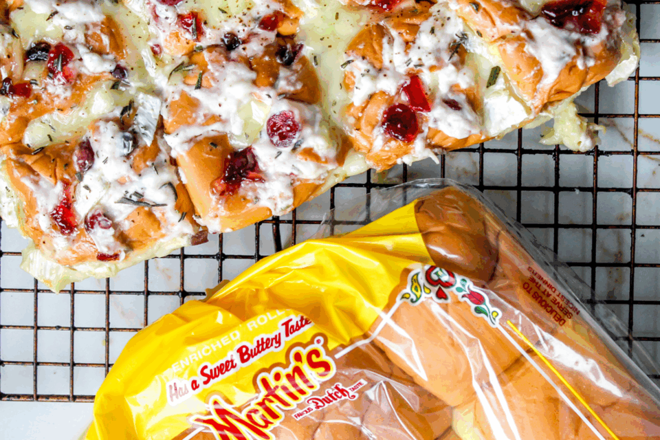 Using a sharp knife, make 4 slices into each Martin’s Sweet Dinner Potato Roll. The slices should only go about halfway through the roll, keeping it together. Start from top to bottom, left to right and then diagonally. Using a knife, add the jam filling into each of the crevices of the roll.