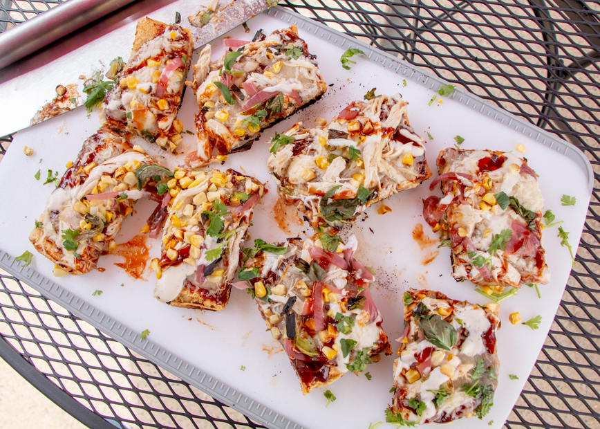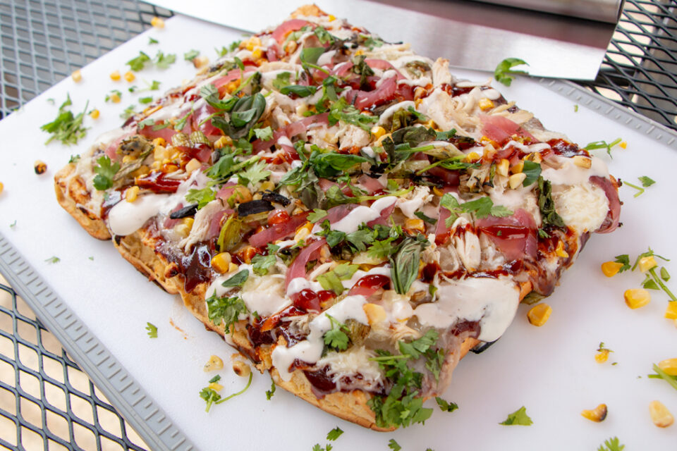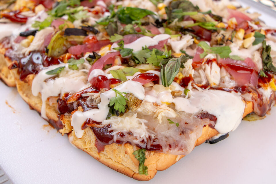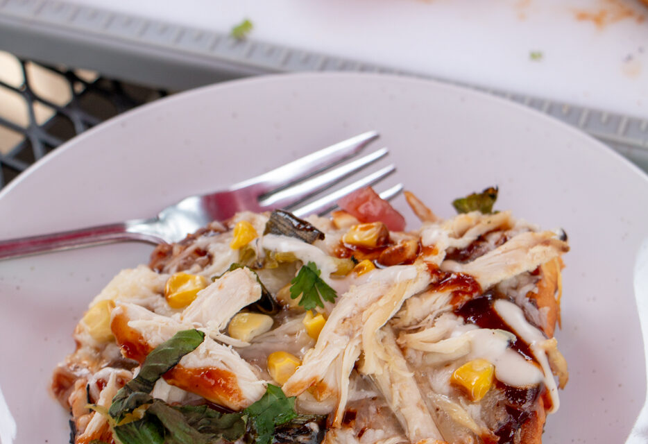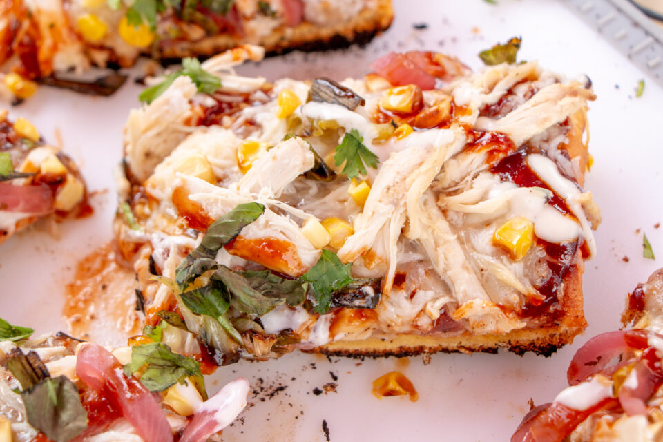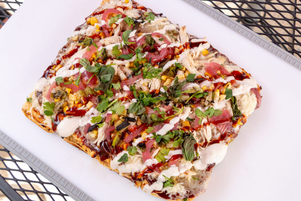 Add corn, chicken, green onion, pickled onion, a drizzle of BBQ sauce, and a light drizzle of ranch.