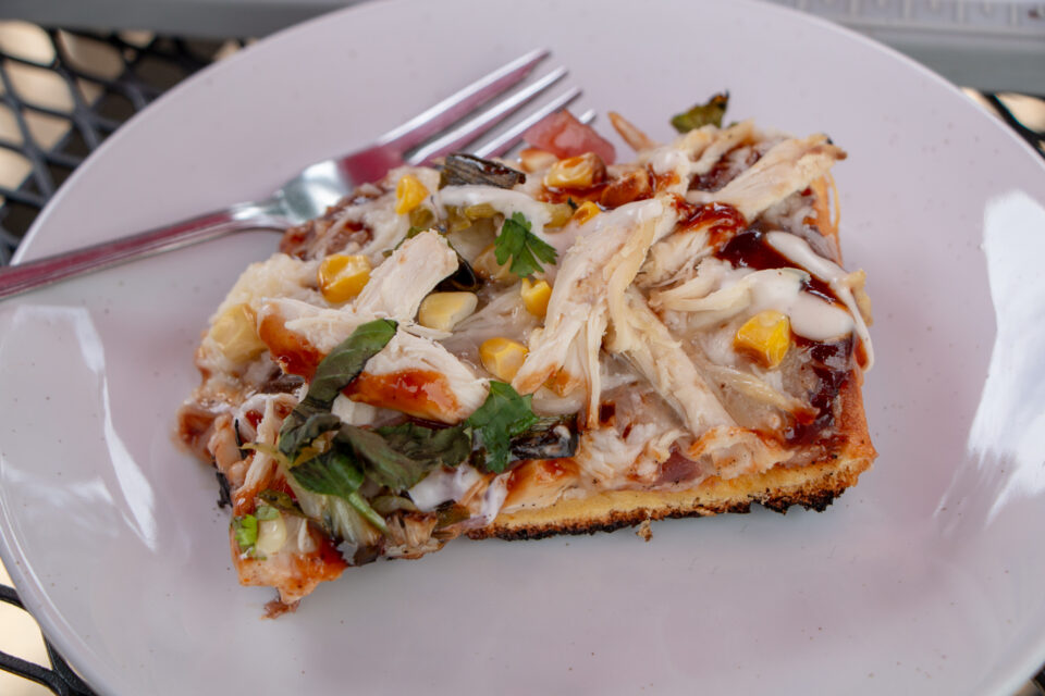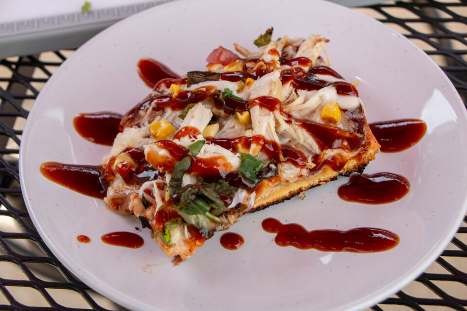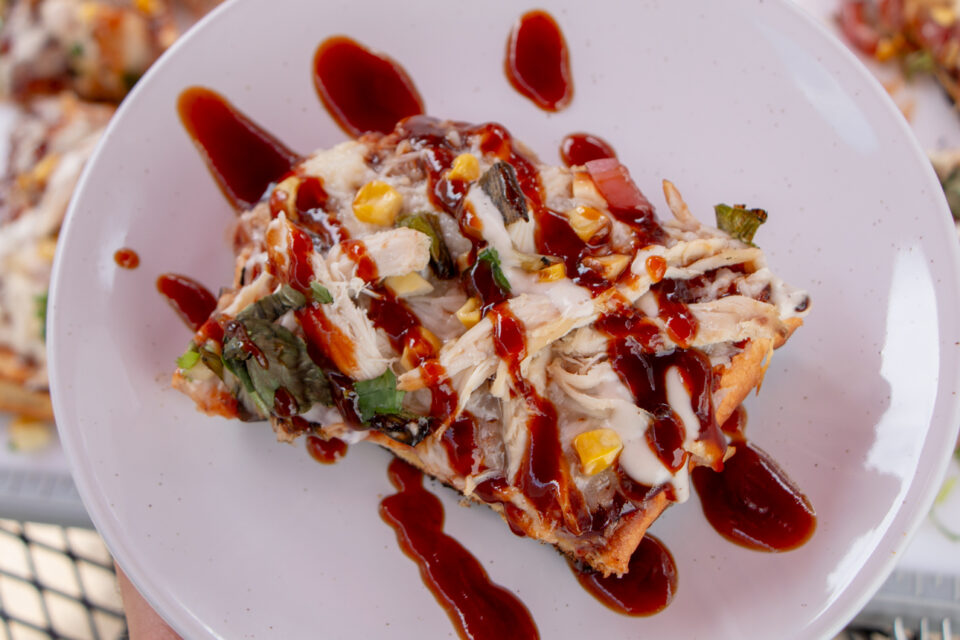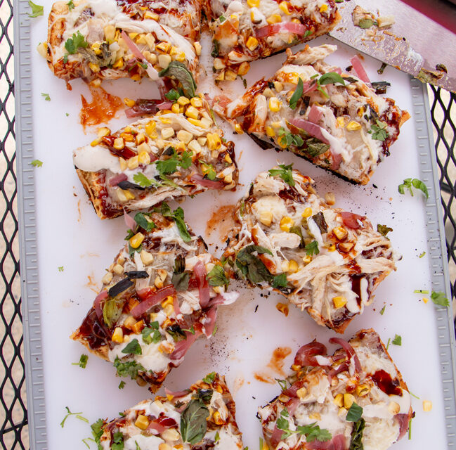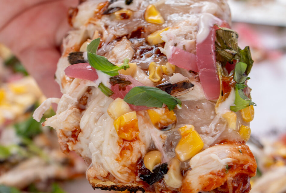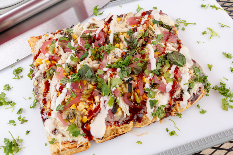 Add corn, chicken, green onion, pickled onion, a drizzle of BBQ sauce, and a light drizzle of ranch.