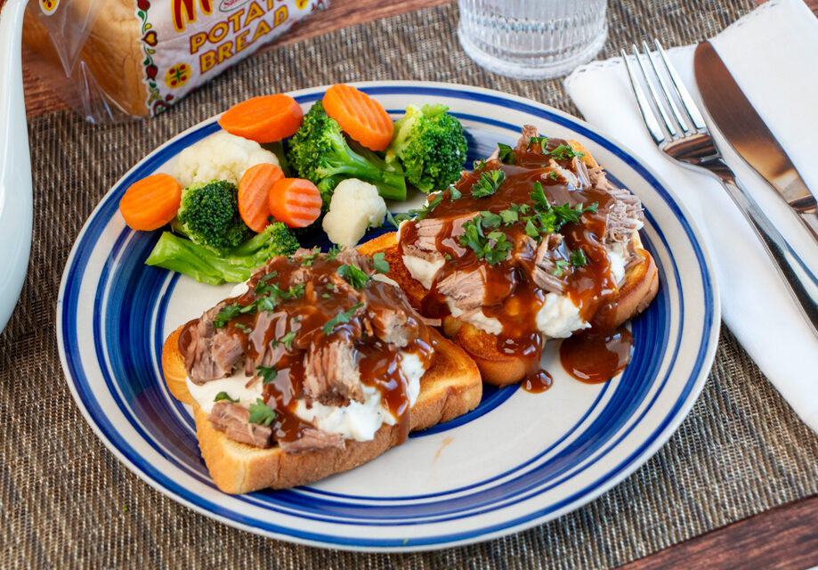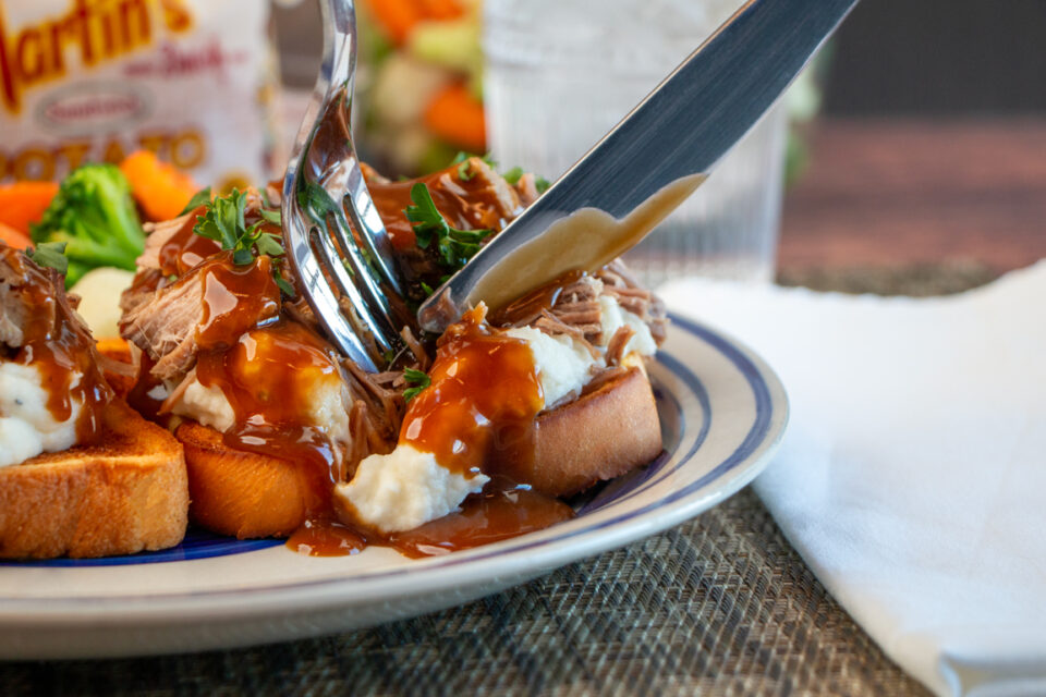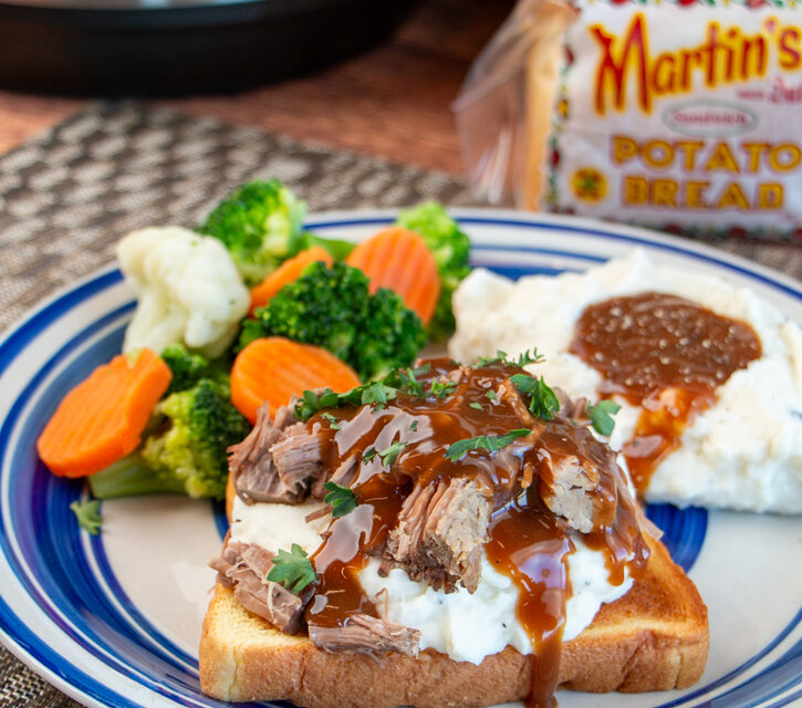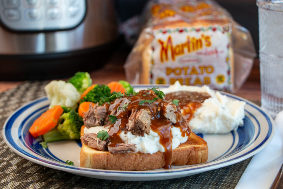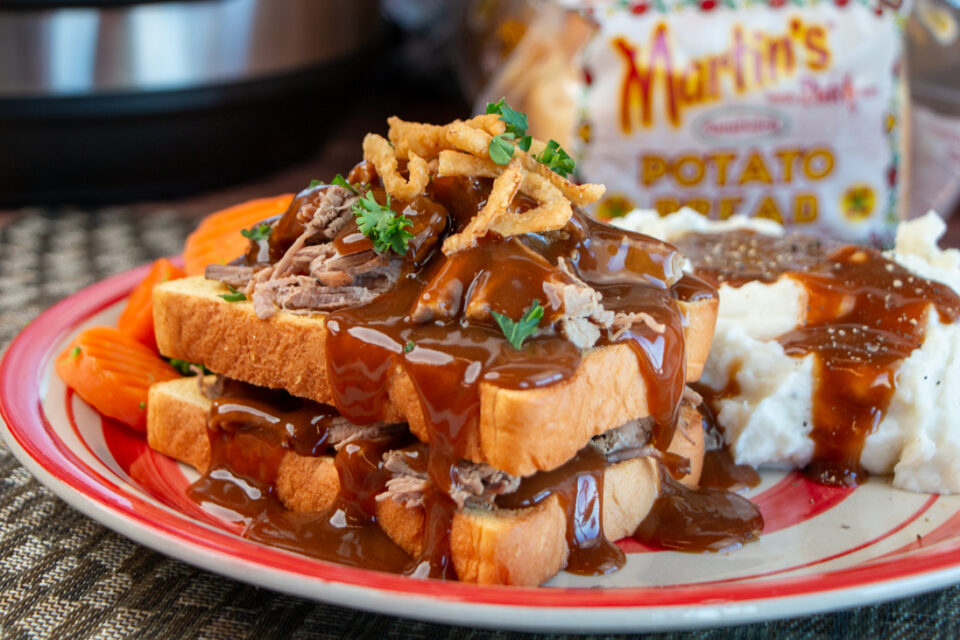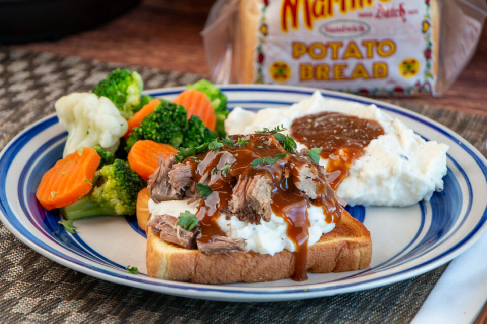 Serve the shredded beef and gravy over Martin’s Potato Bread with mashed potatoes and your favorite vegetable.
