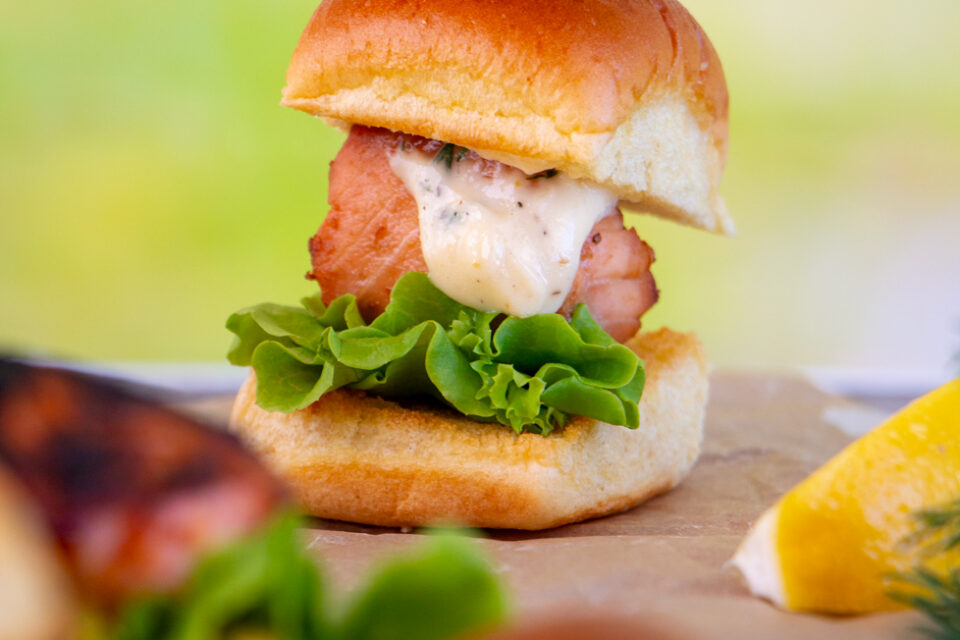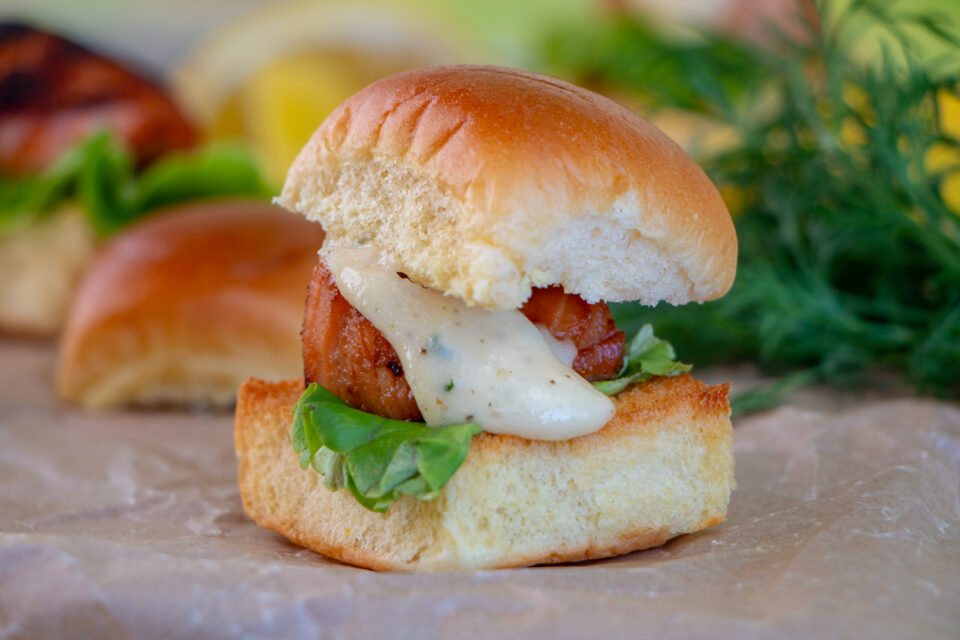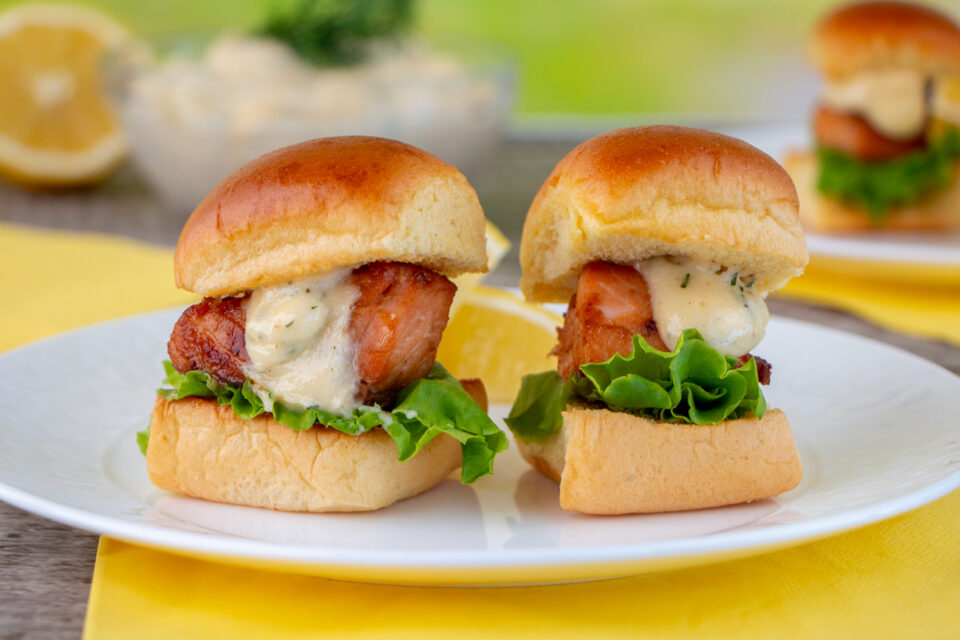 Top bottom buns with lettuce, salmon, and lemon garlic aioli, then add top buns. Serve and enjoy.