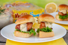 Add 6 slices of mozzarella cheese on top of the sauce, layer with 12 slices of pepperoni, then top with the chopped bacon. Add the remaining 6 slices of mozzarella cheese, followed by the remaining 12 slices of pepperoni. Place the top halves of the rolls on top of the pepperoni.