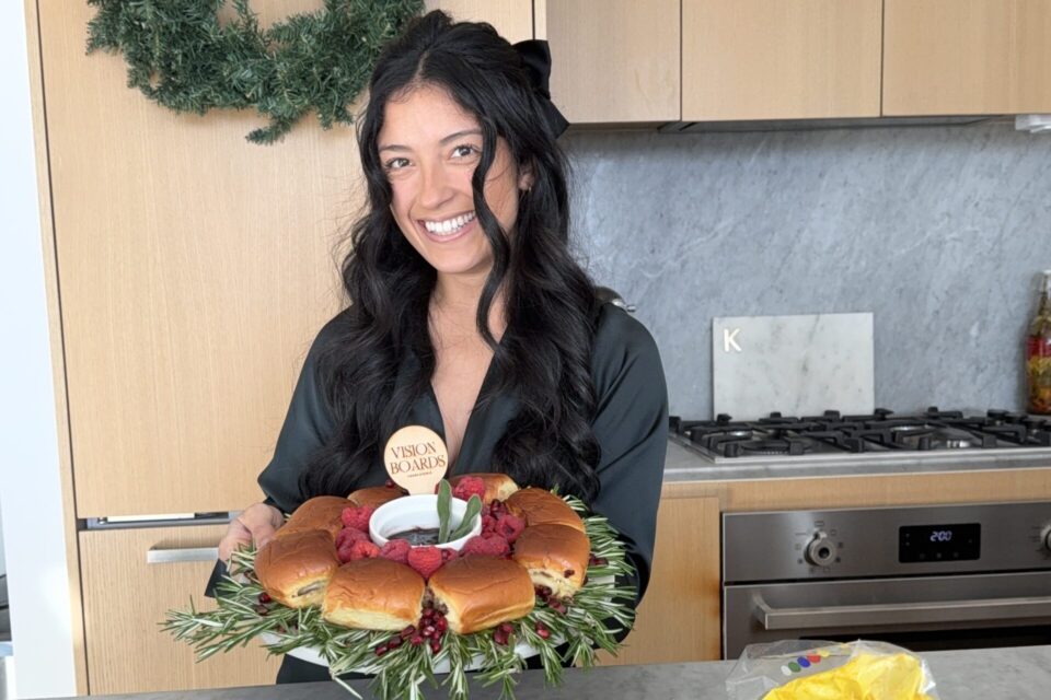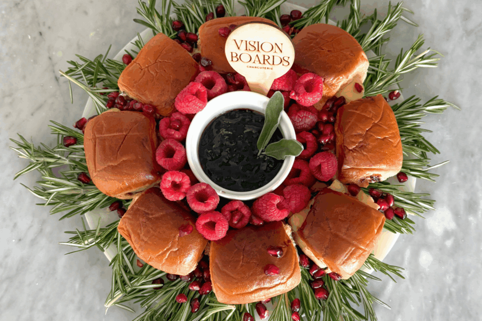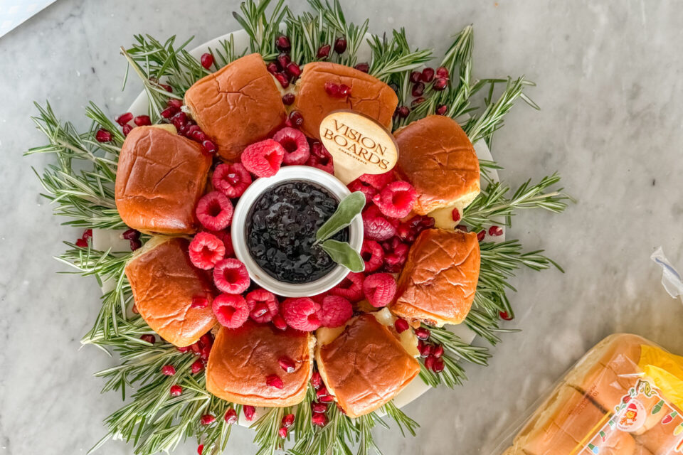 Line a round marble platter with rosemary and place your baked rolls in a circular “wreath-like” shape.